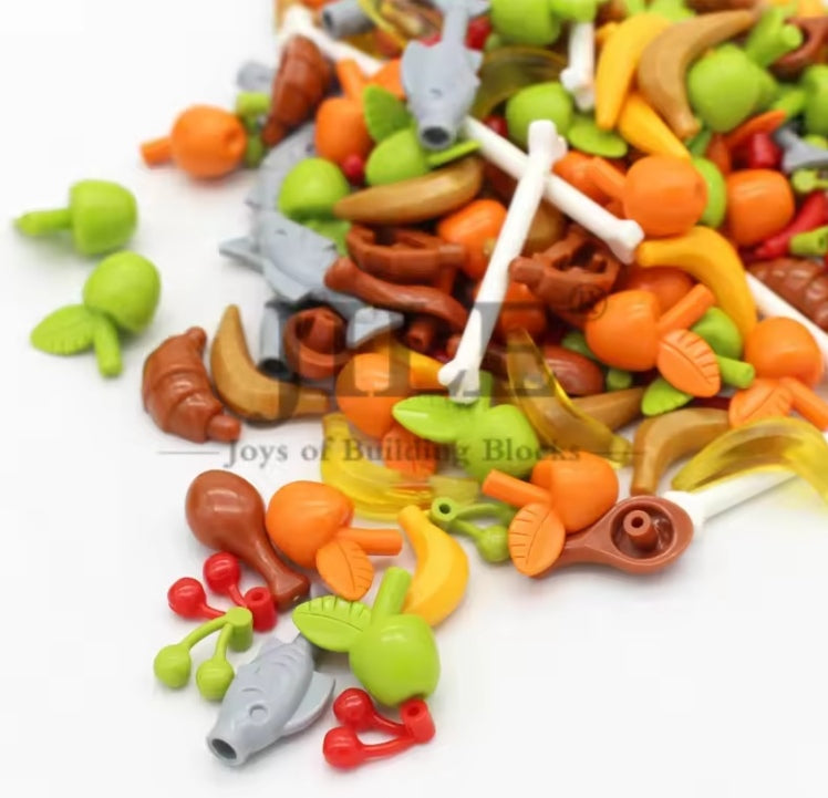 Moc Food Building Blocks Parts Fruit Frish Dish Drumstick Sausage Bone DIY Bricks Bulk Set Compatible with City View Toys Weigh